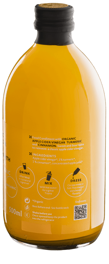 Infusion of organic apple vinegar with cinnamon and turmeric. A sweet and acidulous contrast that gives a discharge of novelty to the traditional product.