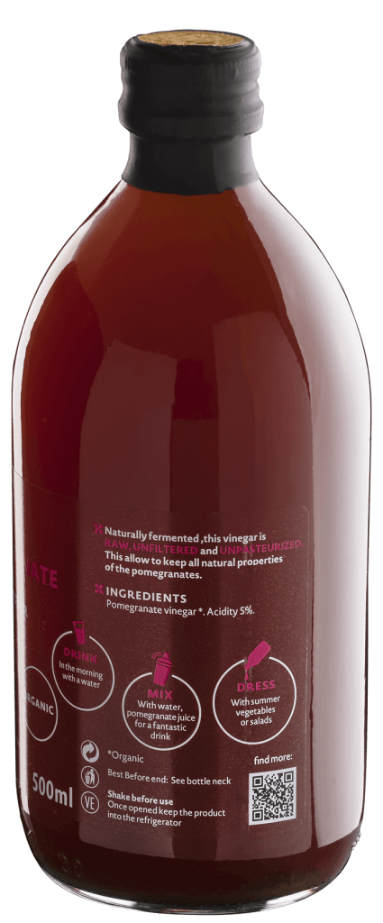 This pomegranate vinegar is of proteins and enzymes as it is unfiltered and unpasteurized, which means that it is produced in a natural way.